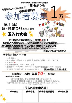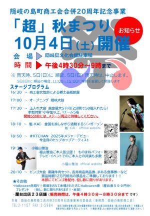 ニュース イベント 2025-09-26 隠岐の島町商工会合併20周年記念事業 「超」秋まつりの開催について ※玉入れ大会は参加チームが10チームに達したため受付は終了しました ・「超」秋まつりチラシ ニュース一覧へ戻る